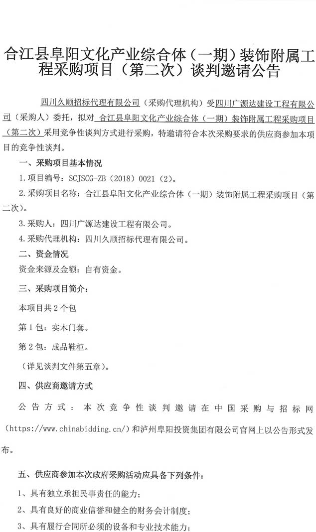 合江縣阜陽文化產(chǎn)業(yè)綜合體(一期)裝飾附屬工程采購項(xiàng)目(第二次)談判邀請公告.docx